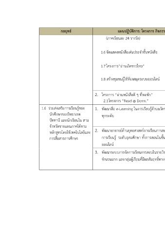 แผนปฏิบัติการ: โครงการ กิจกรรม งบประมาณ ระยะเวลา ผูรับผิดชอบ ้ 2,500 บาท 2557 อรอนงค์ (ภาคเรียนละ 24 รางวัล) 6,000 บาท 2557 นุสรา โต๊ะเซะ/ร่มฉัตร/จนท. จัดแสดงหนังสือเด่นประจําชันหนังสือ ้ จัดชัน ้ 20,000 บาท 2557-2560 กุลวดี และคณะ โครงการ”อ่านเถิดชาวไทย” 1.8 สร้างชุมชนผูใช้ห้องสมุดระบบออนไลน์ ้ - 2557-2560 นักวิชาการคอมพิวเตอร์ บรรณารักษ์/จนท. โครงการ “อ่านหนังสือดี ๆ ทีหอพัก” ่