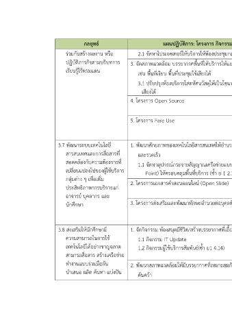 แผนปฏิบัติการ: โครงการ กิจกรรม งบประมาณ ระยะเวลา ผูรับผิดชอบ ้ บาท 30,000 2556 สมบูรณ์ 2.1 จัดหาโปรเจคเตอร์ให้บริการให้ห้องประชุมกลุม 2 เครือง ่ ่ 3. จัดสภาพแวดล้อม บรรยากาศพืนทีให้บริการให้แยกโซนชัดเจน ่ ้ เช่น พืนทีเงียบ พืนทีประชุมใช้เสียงได้ ่ ้ 114,000 บาท 2556 สมบูรณ์ 3.1 ปรับปรุงห้องบริการโสตทัศนวัสดุให้เป็นโซนทํางานกลุมทีใช้ ่ ่ - ฝ่ายเทคโนโลยีทาง การศึกษา 2557-2560 ฝ่ายเทคโนโลยีทาง การ