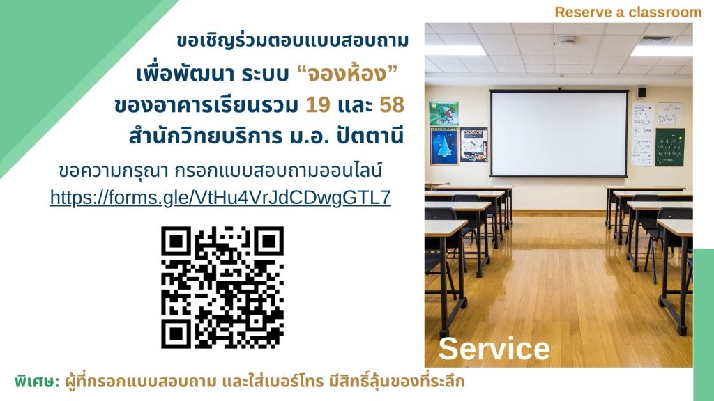 | เนื้อหา | ขอเชิญร่วมแสดงความคิดเห็น! นักศึกษา / อาจารย์ / บุคลากร เพื่อพัฒนา ระบบ “จองห้อง” ของอาคารเรียนรวม 19 และ 58 สำนักวิทยบริการ ม.อ. ปัตตานี ลิ้งระบบ https://sos.oas.psu.ac.th/roomservice/